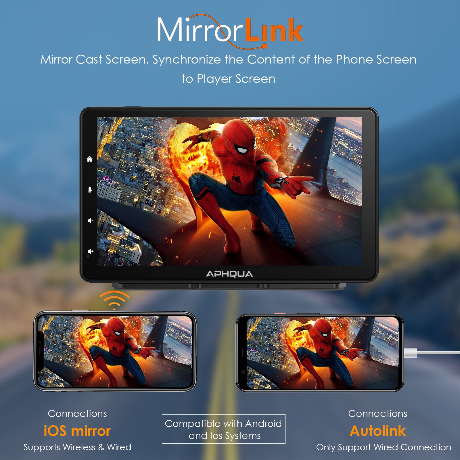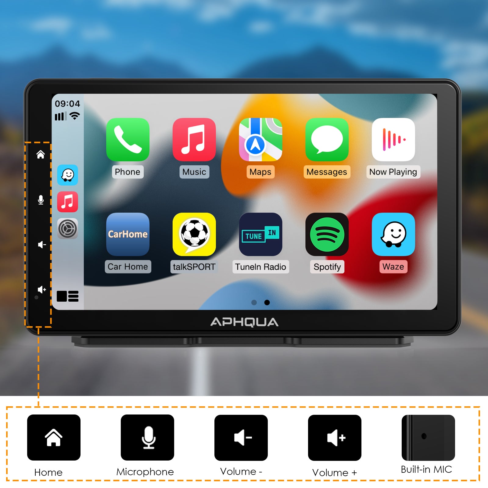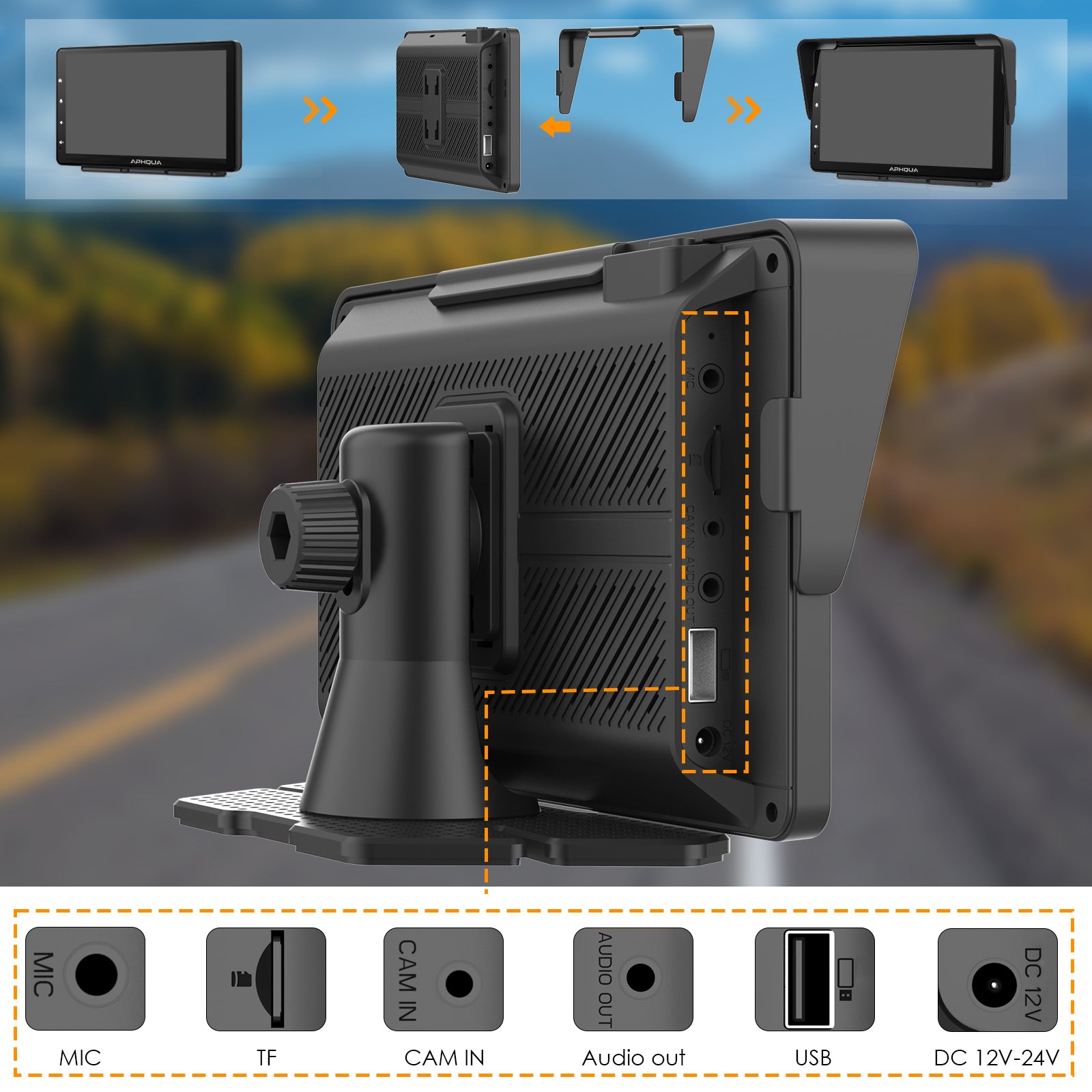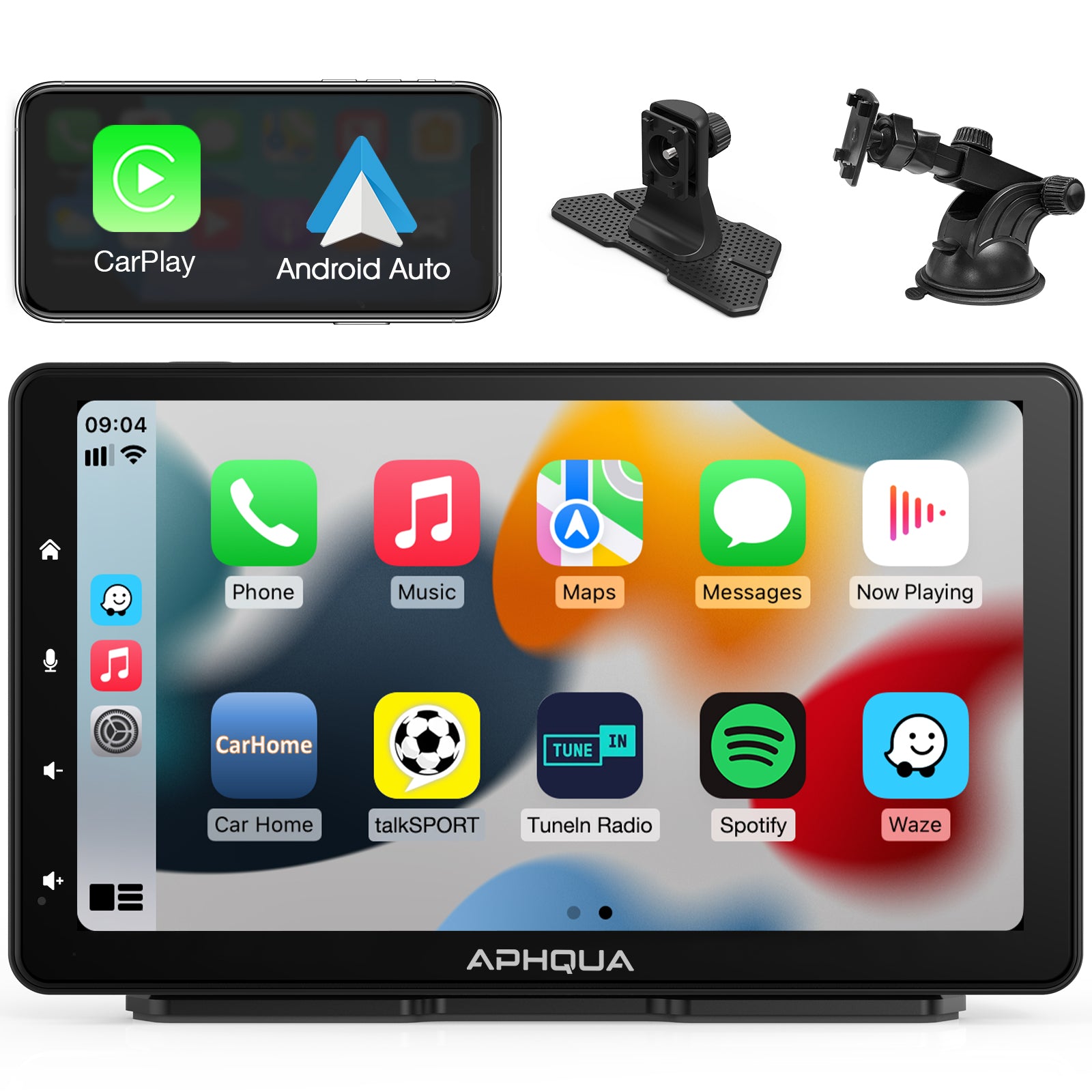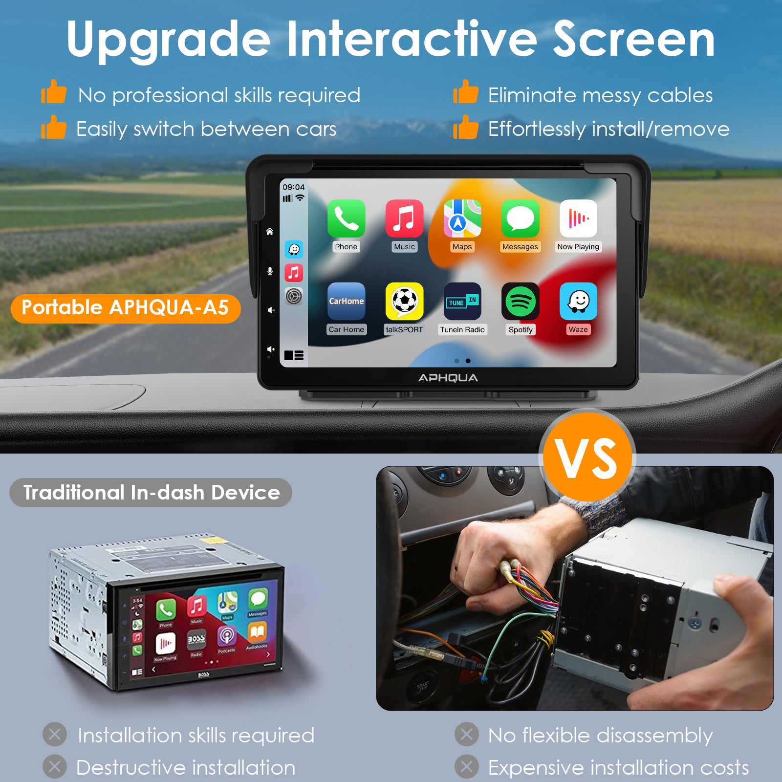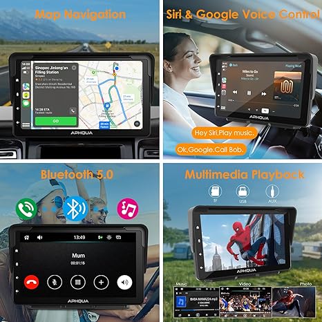 APHQUA A5 Portable Wireless Apple CarPlay and Android Auto with Detachable Sunshade, 7 inch Touch Screen Display for All Vehicle&Truck