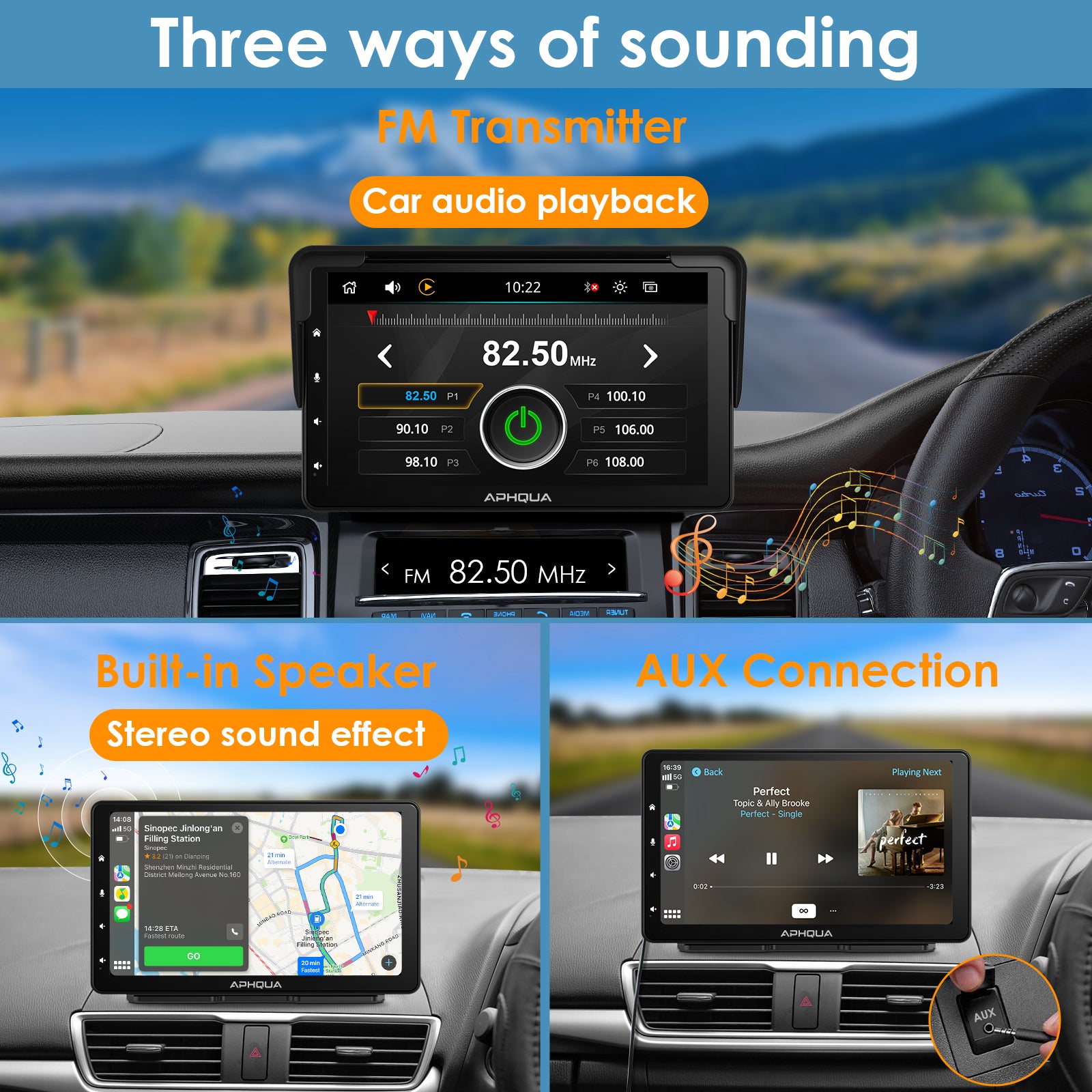 Three kinds of audio output: FM transmitter/AUX cable/ Built-in 5W speaker