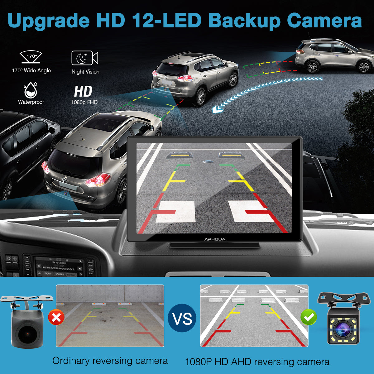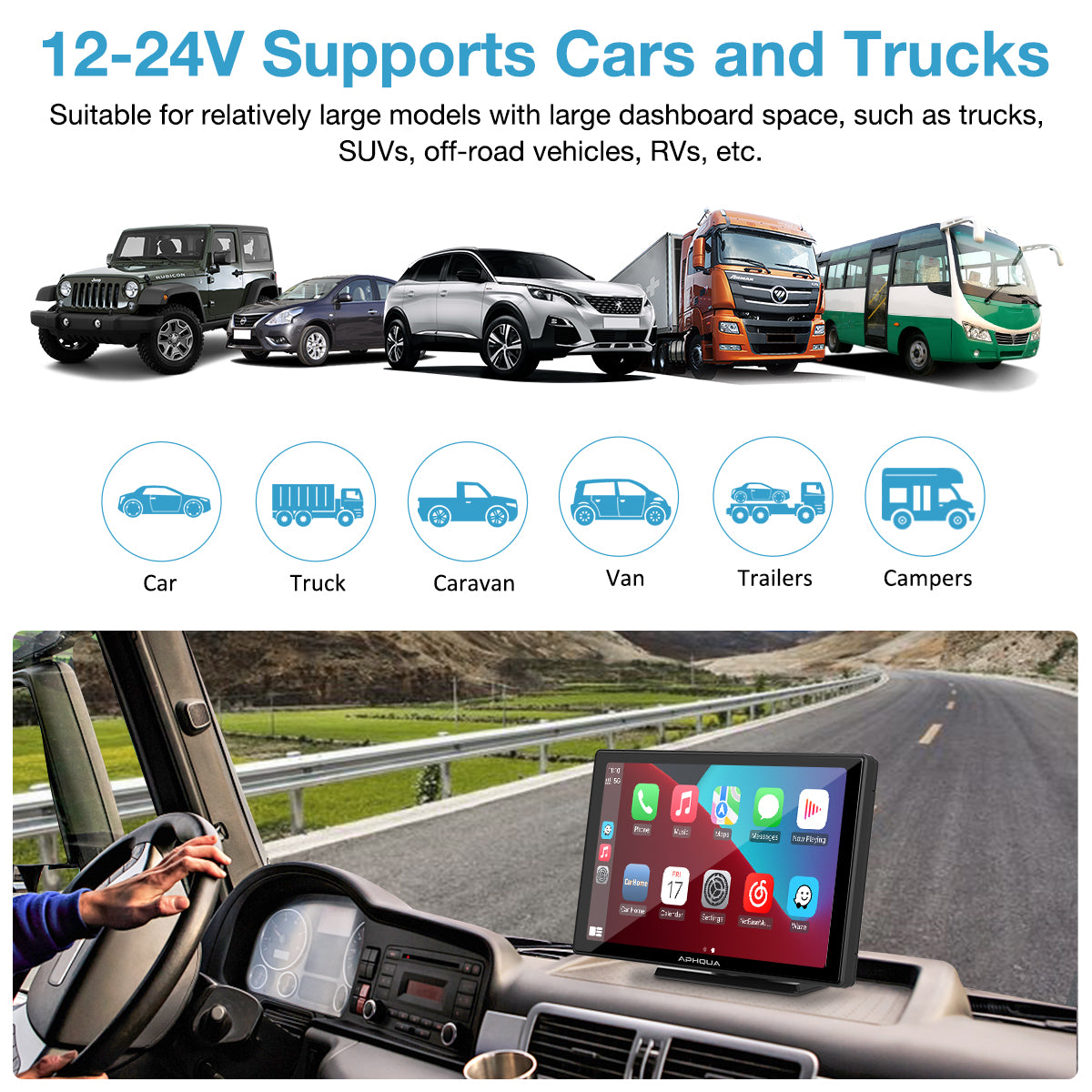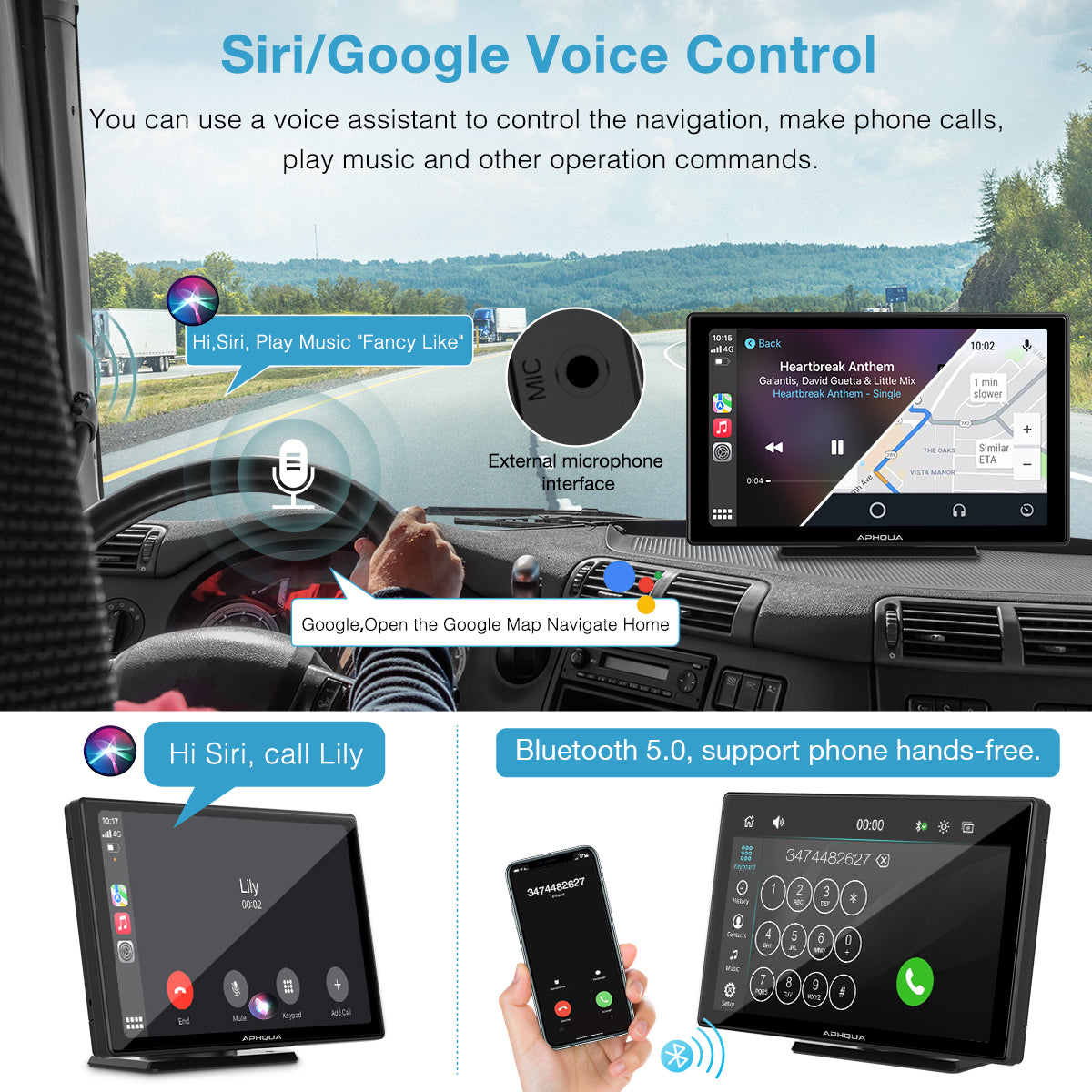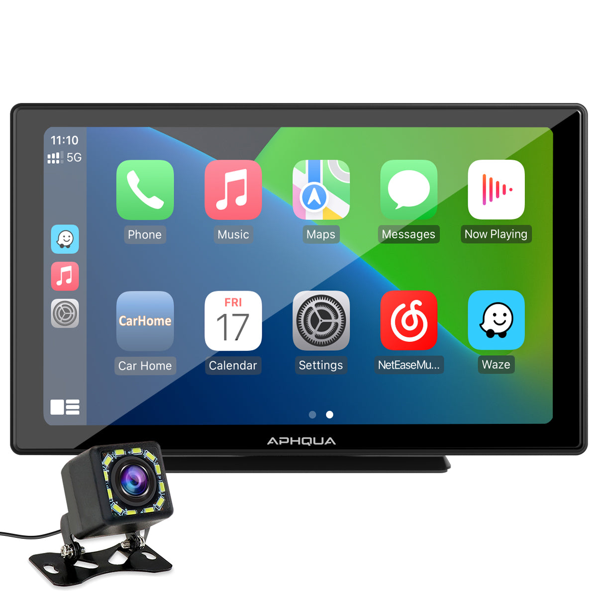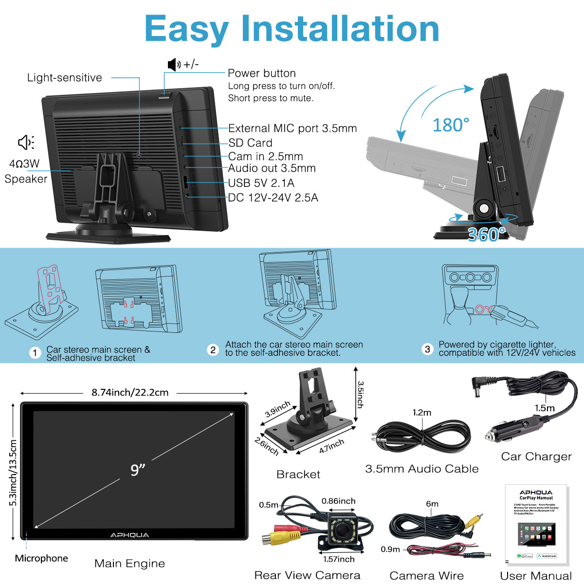 APHQUA Wireless Portable Car Stereo with Light-Sensitive, 9 Inch IPS Touchscreen Car Radio Receiver Works with Carplay, Android Auto, Mirror, Bluetooth, Google, Siri, WiFi, GPS Navigation,Rear Camera